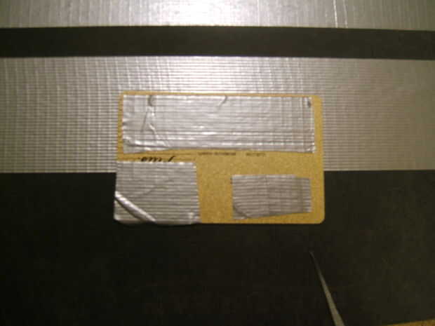 Estos bolsillos mantenga sus tarjetas de crédito y tarjetas de regalo. Colocar una tira de cinta adhesiva para conductos, con la tarjeta en él. Corte la raya un poco margen de maniobra a ambos lados. He encontrado que 10cm es una longitud buena.