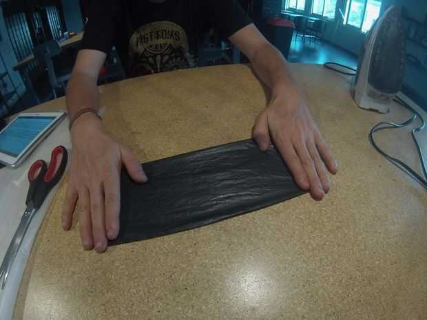 Si la extiendes ya recortada vas a notar tiene forma de un rectángulo. Ya la bolsa está extendida formando una lámina de plástico rectangular, la doblamos. La doblamos de nuevo hasta quede una franja. Esto es para la bolsa quede más gruesa.