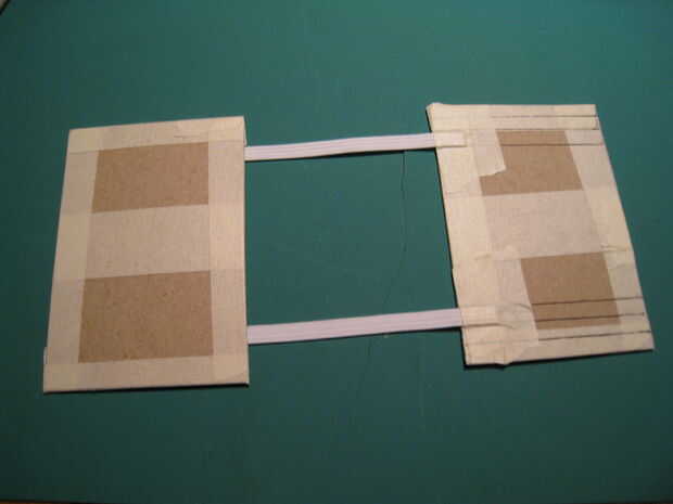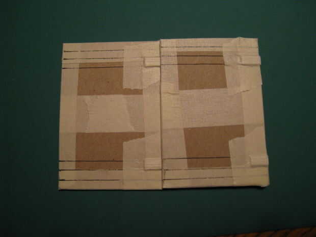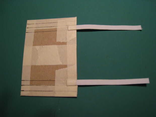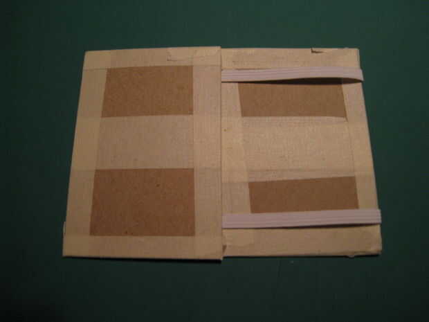 Tomar el 4 dos pulgadas. tiras y poner sobre el tablero de tarjeta así que poco a poco toca y es en el tercer espacio. Luego la cinta. Luego poner la otra sección del Junta de la tarjeta en la parte superior del elástico, Rap el elástico alrededor del tablero de tarjeta, por lo que es nuevo en el tercer espacio y cinta hacia abajo.