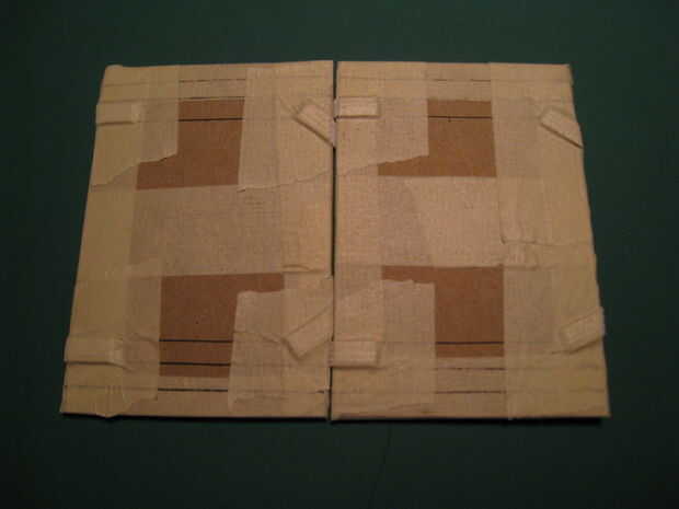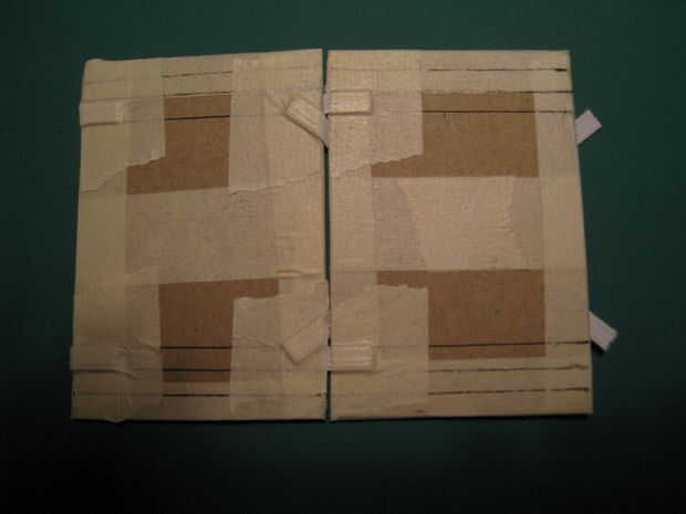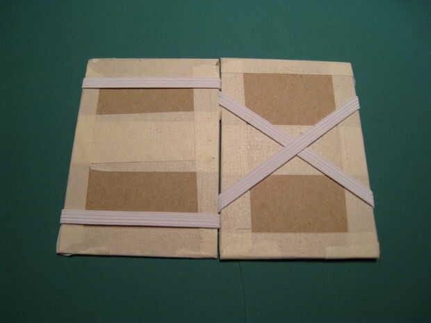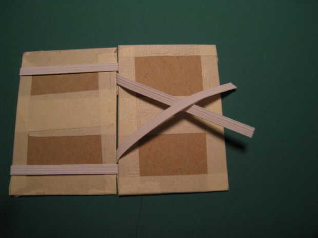 Ahora, se puede obtener tus franjas dos 4.5 pulgadas de elástico y tejerlos hasta por en medio de tus piezas del tablero dos tarjeta y asegúrese de que tienen e igual sobre colgar a cada lado. Luego con cinta adhesiva sobre la tercera línea. Después, plegar el otro lado del elástico justo encima de la tercera línea y cinta. Echa un vistazo a las fotos para asegurarse de que usted lo hizo bien.