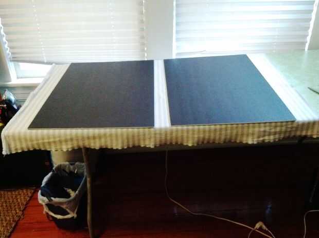 Centro de la base de la espuma sobre la tela tanto como sea posible. Asegúrese de dejar un espacio entre las dos hojas! Dejé un espacio de 2.5 pulgadas en el centro y un borde de tela de 4 pulgadas en los cuatro lados. Asegure las cuatro esquinas de la espuma las hojas centrales con una gota de pegamento caliente.