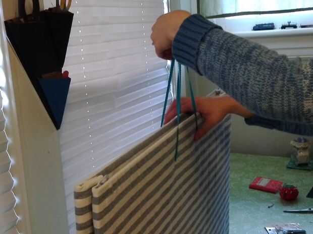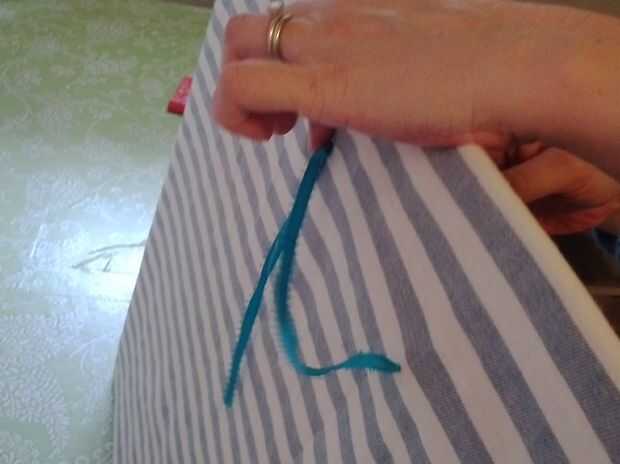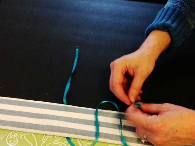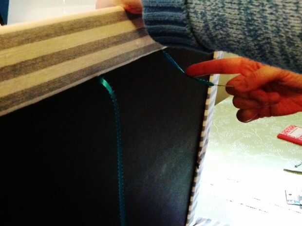 Ahora para las manijas y cierre! Marca donde todo se supone para ser y llegar a puñaladas! He utilizado el extremo puntiagudo de una brújula. Pude conseguirlo para ir fácilmente a través de ambas hojas de la base de la espuma. Rosca la cinta en una aguja de reparación (cualquier aguja realmente si el ojo es bastante grande) y que pasa por los agujeros a puñetazos. Había asegurado con un nudo muy carnoso y asegura el nudo con un poco de pegamento. Asegúrese de que ambos tiradores tienen la misma longitud. Repetí este paso en el centro, por encima de las manijas, para unir piezas de cinta para atar la cartera cerrada.