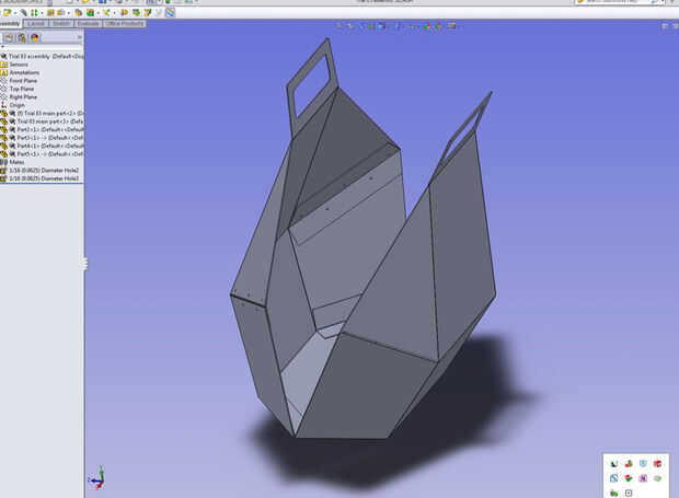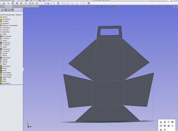 Construir un modelo de CAD de Solidworks. Aplane el patrón usando funciones de chapa en Solidworks. Exportar el dibujo del plano patrón en Illustrator y perfeccionar los detalles. (Aquí he añadido los dobladillos en Illustrator, pero también puede hacerlo directamente en Solidworks).