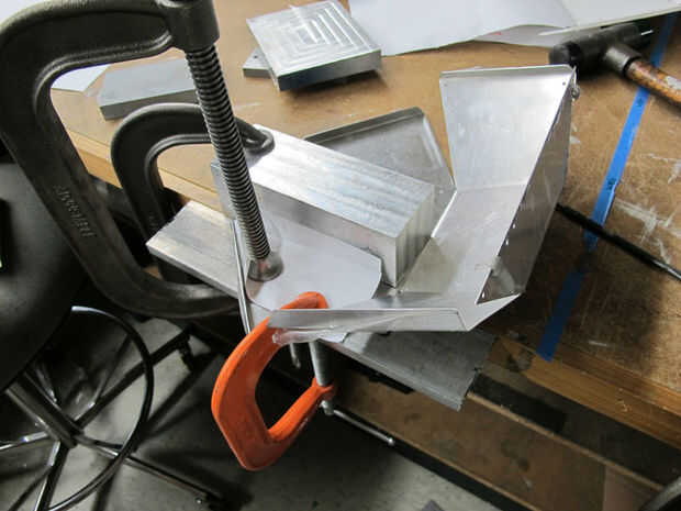 El resto de las curvas no se puede hacer en un freno de caja y pan. Utilizar bloques de acero/aluminio y abrazaderas para asegurar parte de la hoja y luego doblar a mano. Utilice un martillo de goma para golpear suavemente el borde doblado para agregar a su frescor.