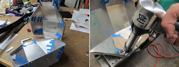 Del remache de las fichas en su lugar utilizando una pistola de remache de presión de aire. El exterior de la bolsa a alto brillo y limpiar el interior.