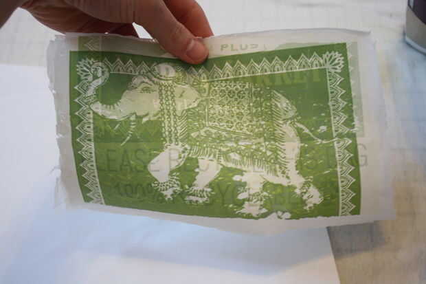 Levante una esquina del papel, si tienes una sólida capa de plástico, que es dorados, si no, mantener planchado un poco.