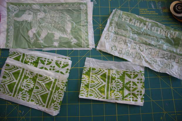 Ahora, con la plancha en una posición baja, coloque un trozo de papel hacia abajo, y luego la primera pila de plástico en la parte superior, luego coloque otro pedazo de papel sobre que, básicamente un sandwich donde el papel es el pan y el plástico es la triste excusa para carne.
