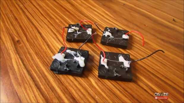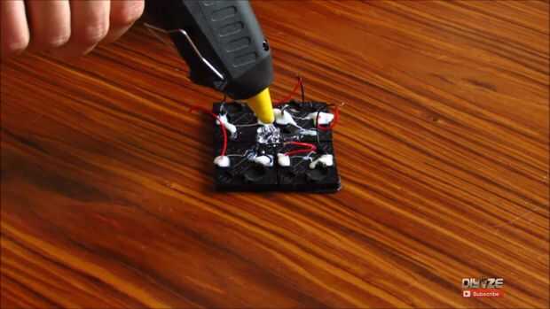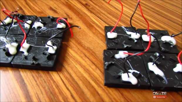 Así que esto es matemática pura, tiene que total de 5-6 voltios cargar su teléfono. Cada una de las células solares pone hacia fuera aproximadamente 1,5 voltios. Por lo tanto tenemos que conectar dos celdas en serie que 3 voltios y otra en serie por lo que tenemos x2 3 voltios. Luego éstos en serie cable otra vez y obtenemos 6 voltios. Decidí doble los amperios y hacer 2 grandes paneles solares de 6 voltios y cable en paralelo más adelante. Entonces yo asegurada con pegamento caliente.
