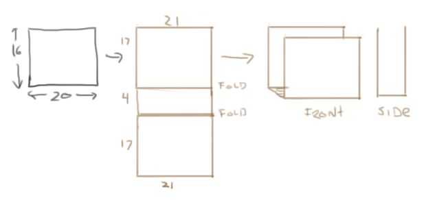 Para los 2 lados de 17 x 21" se unieron a un panel de 4 x 21" (véase la ilustración) Use el borde recto cortar el cartón con cuidado y hacer un pliegue limpio. Si tienes tarjeta adicional puede hacer paneles laterales (en este ejemplo sería 2 piezas de 4 x 17") he ido con o sin laterales.