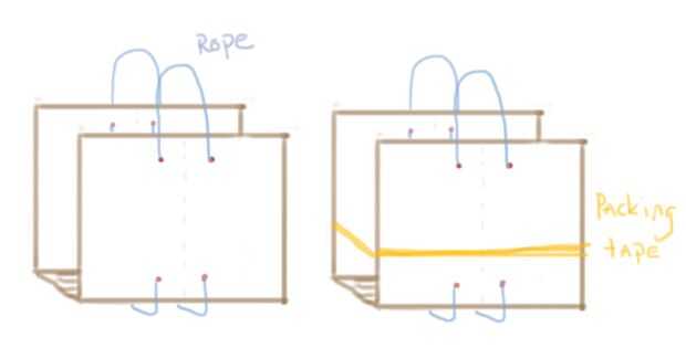 de la cuerda en el exterior de la parte inferior... va en los orificios de la parte inferior y hasta fuera de los agujeros superiores