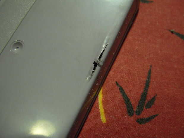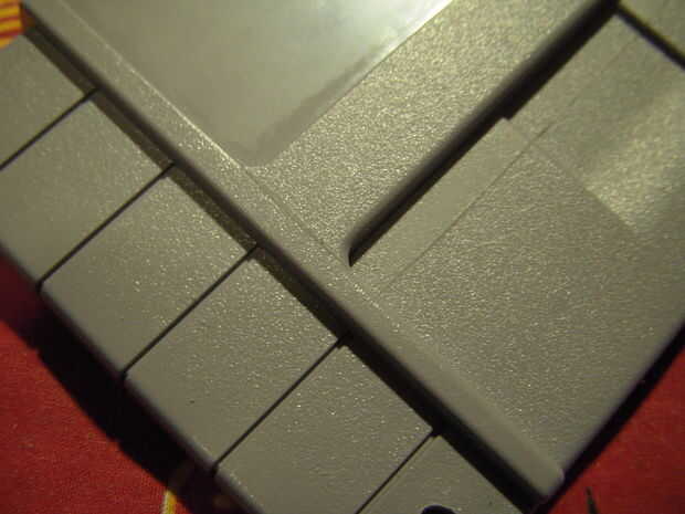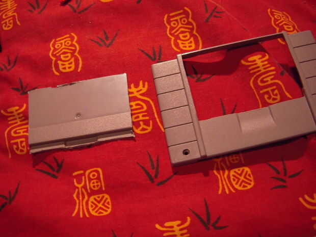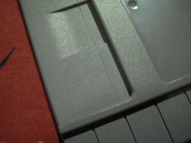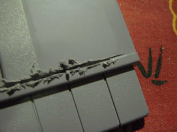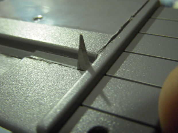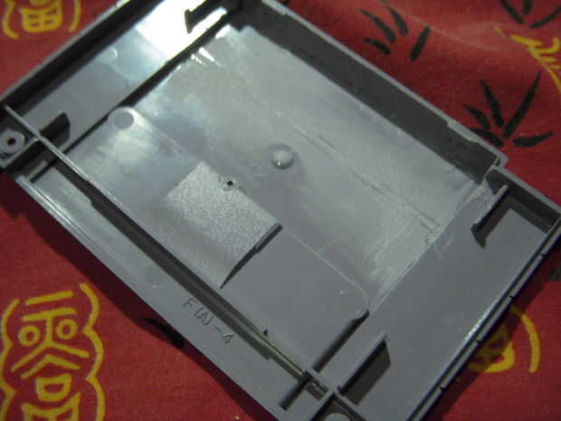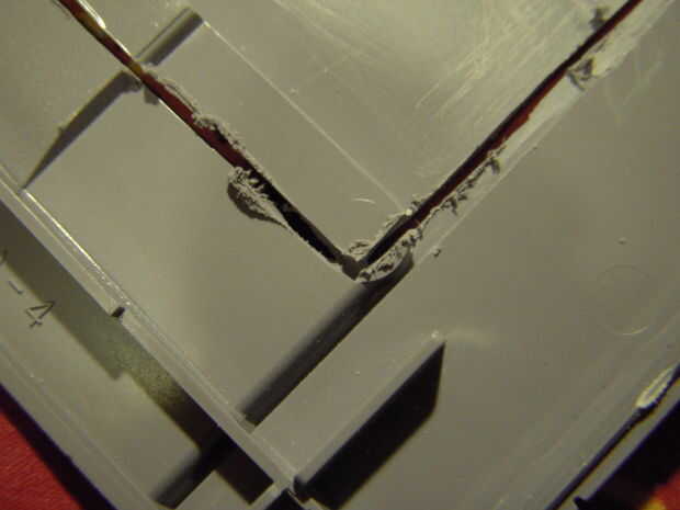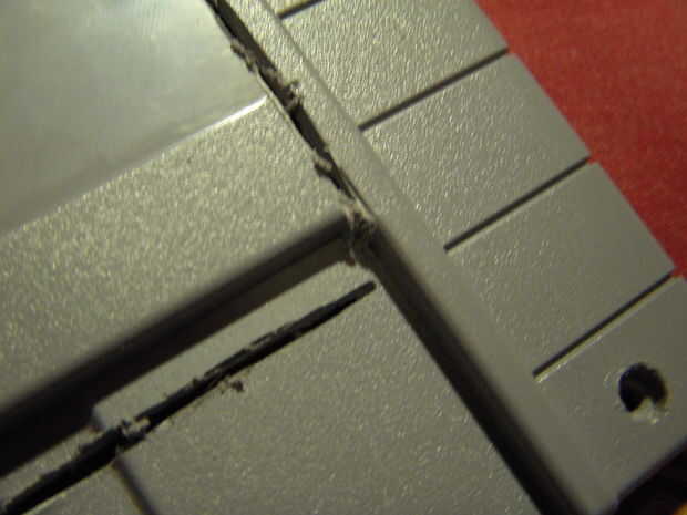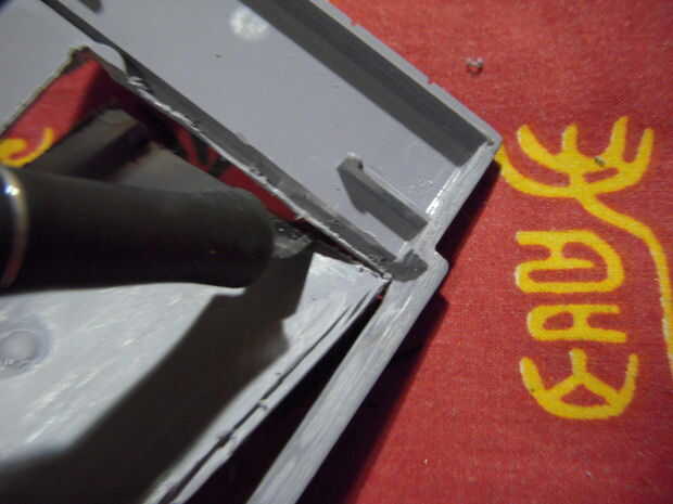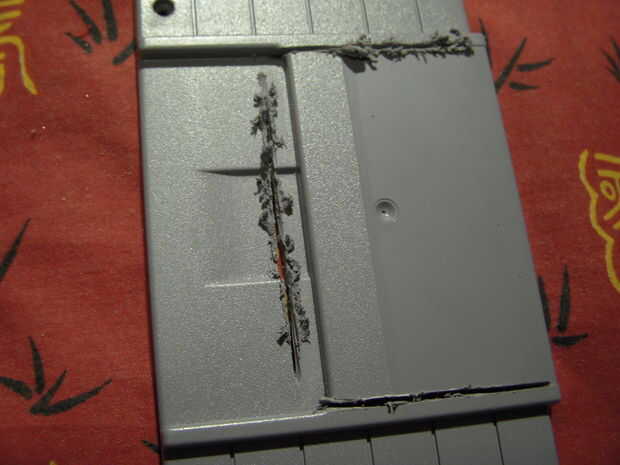 Con el título aún de la placa frontal hacia abajo, tomar su dremel con una herramienta de corte y con su cortador contra el borde superior (no presionar contra él) de una línea a lo largo de la esquina/borde interno superior de corte. ¡No! ir a la esquina de la sección de la etiqueta de título del juego!! Vamos a terminar más tarde con una cuchilla exacto! Queremos que esto sea lo más recto y como sea posible y una dremel, sólo podría de las manos y crear algunos rincones descuidados. Con una cuchilla exacto usted tiene más control.