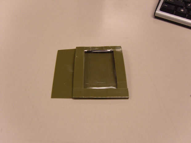 6) con su cinta de embalaje, superponer un trozo de cinta a cada lado del cuadrado cortado (cinta juntos las 2 piezas de cinta adhesiva transparente). Asegúrese de que los bordes de la cinta ponen sobre la hoja de cinta del conducto (los 2 bordes será estrecha pero esto está muy bien).