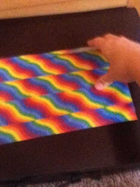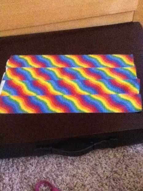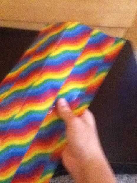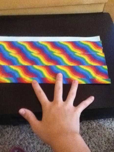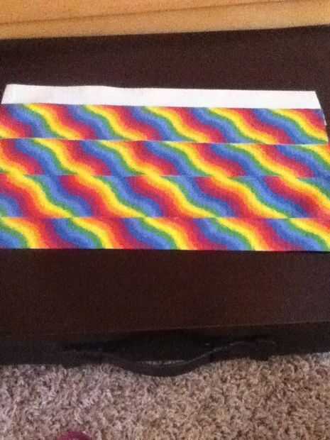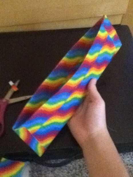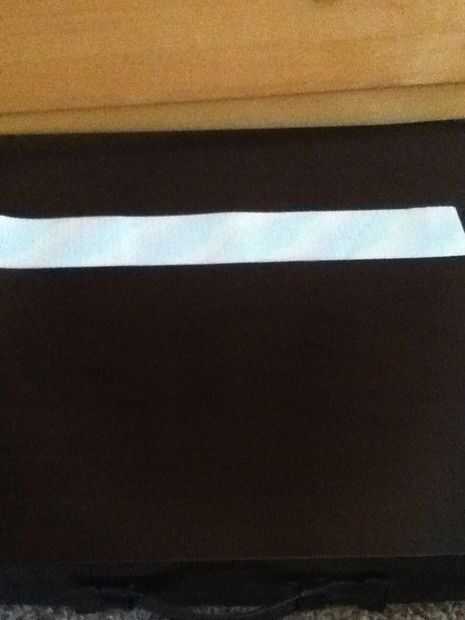 Measure out 8 foot long strips of one color. Pégalos juntos para hacer una hoja y doblar por la mitad maneras largas. Recortar los bordes de la cinta y doblar todo en tercios. Pulse en un libro para aplanar.