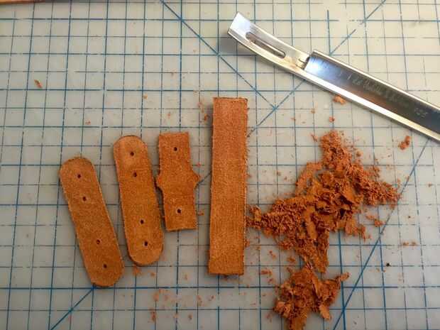 Como es con cuero, no es del mismo grosor, así que raspada abajo algunos pedazos con un cuchillo raspa.