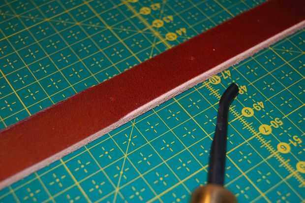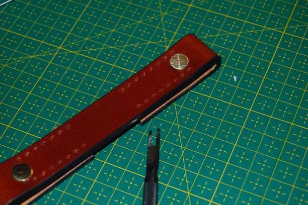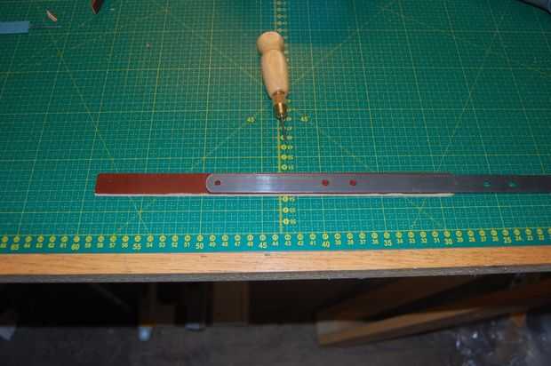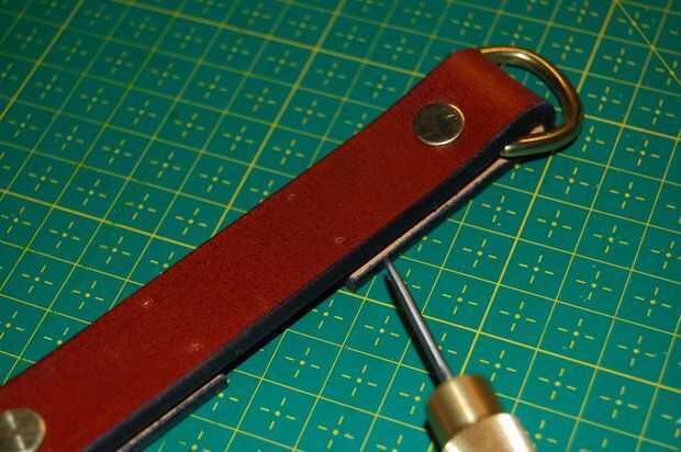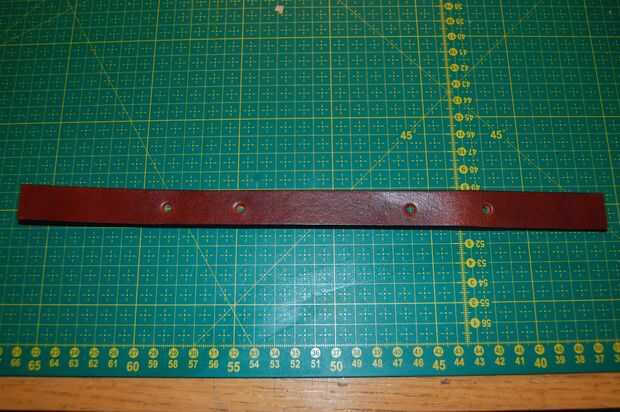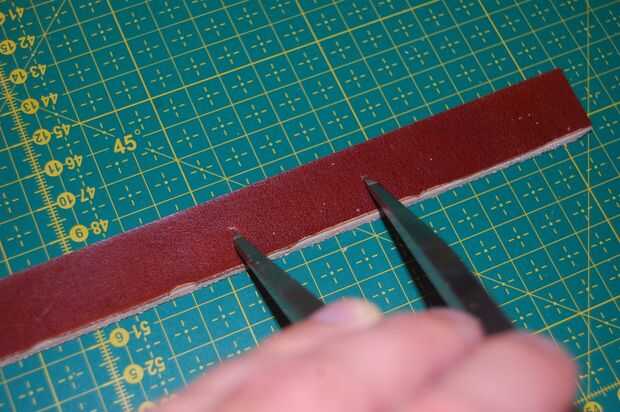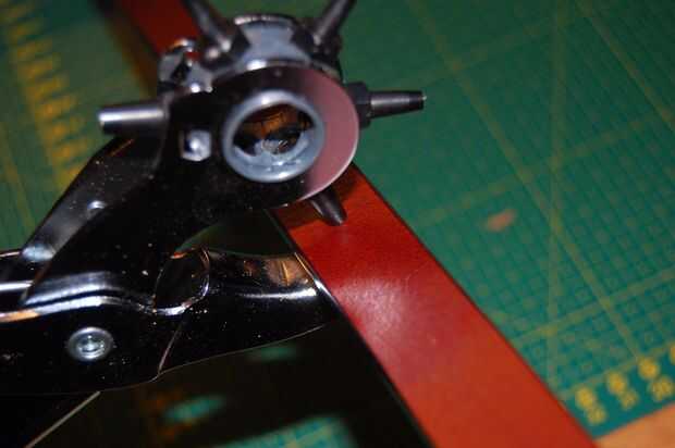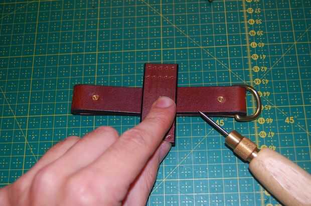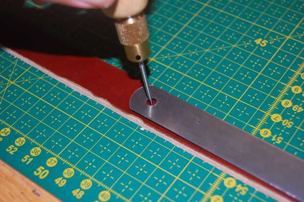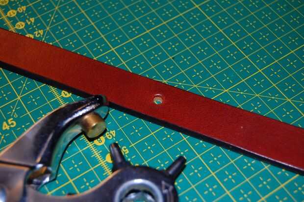 Usé la Faja de hierro para marcar donde los agujeros en la parte superior deben ser y luego usar un divisor de ala para marcar los agujeros de la "parte inferior". Cuando los agujeros de perforación Asegúrese de que está muerto o los bordes se alinean cuando la correa se dobla. Para asegurar que el cuero no se agrietará en la superficie plegada le es necesario mojarlo.