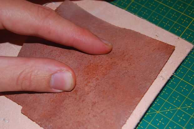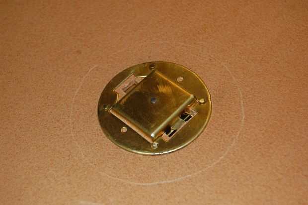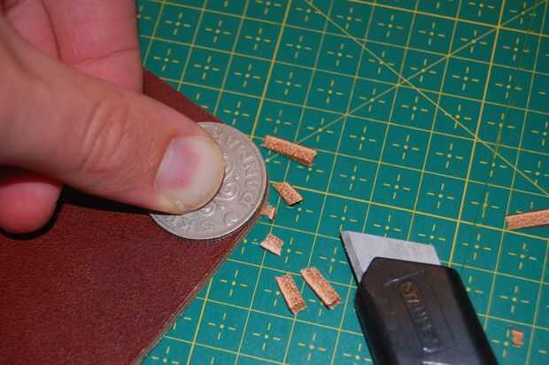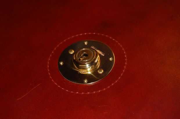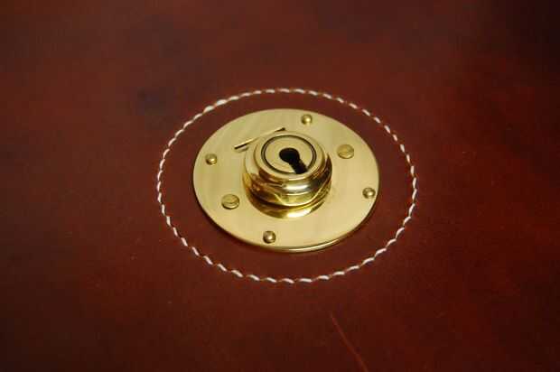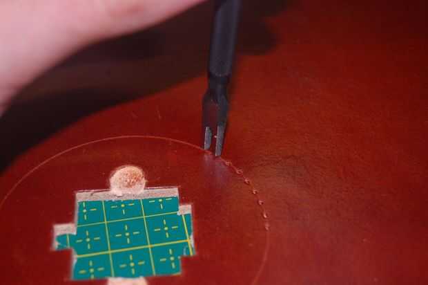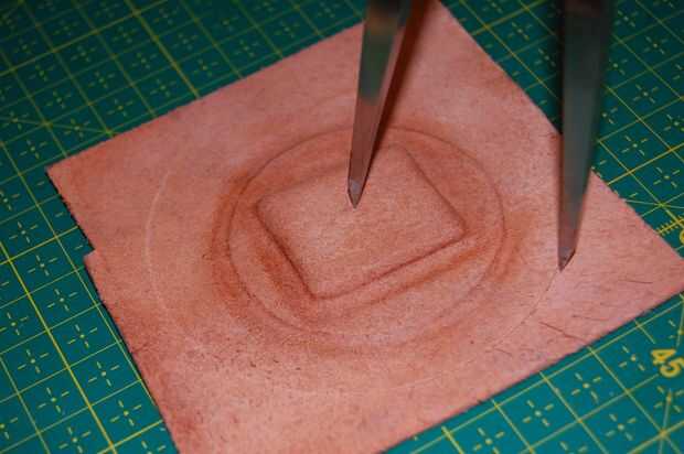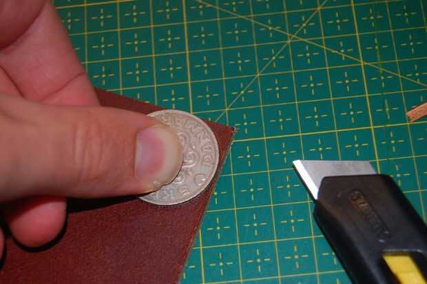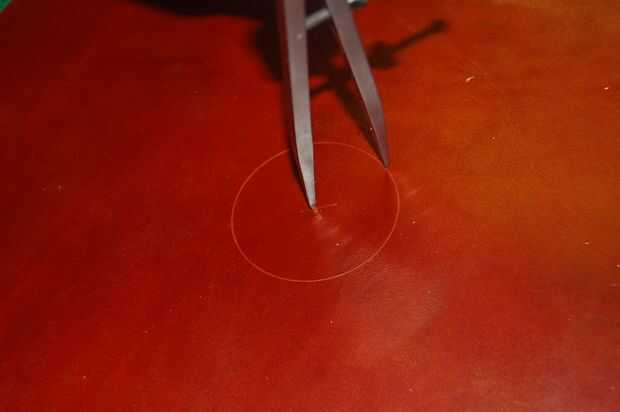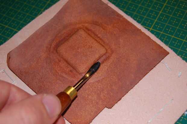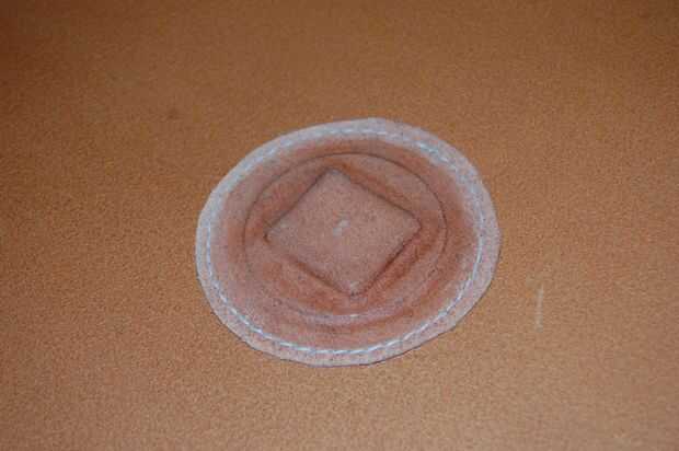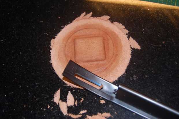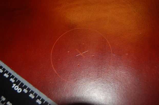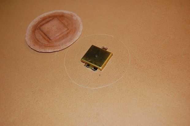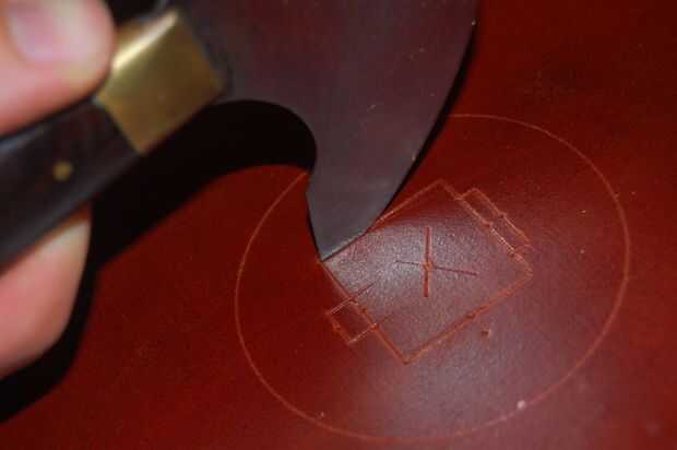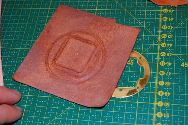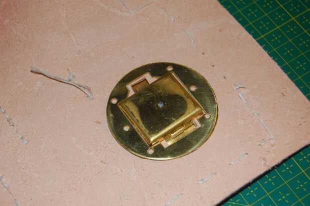 Para cubrir la parte posterior de la cerradura forma un pedazo de cuero (la misma utilizada para la escuadra) mojando el cuero y presionando contra la cerradura. La corte fuera en un círculo con un diámetro de 8,5 cm y skive los bordes antes de cortar a la forma final de (7,5 cm de diámetro).