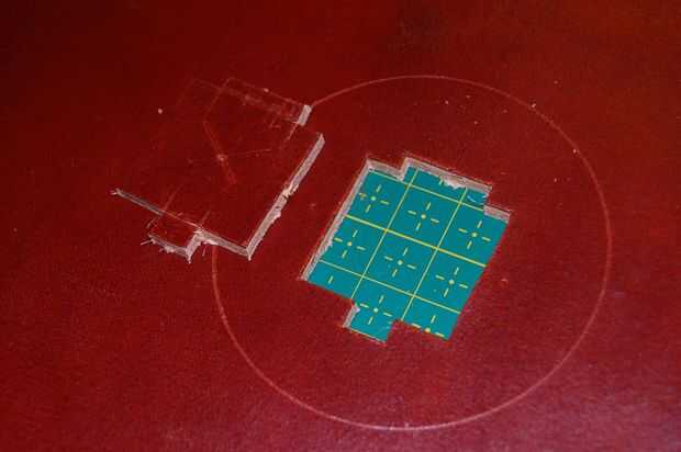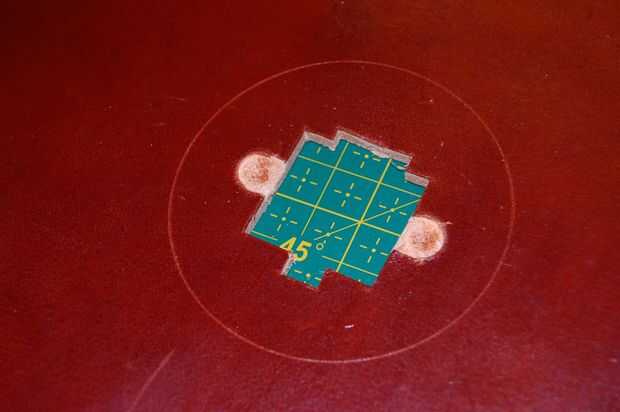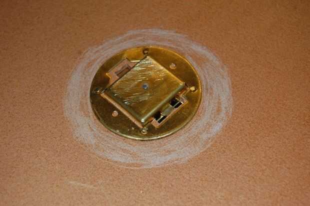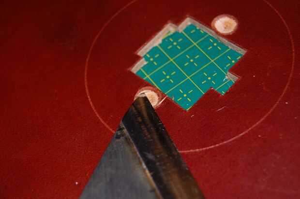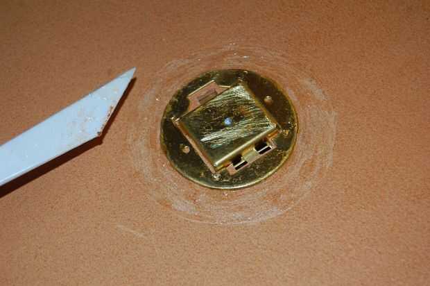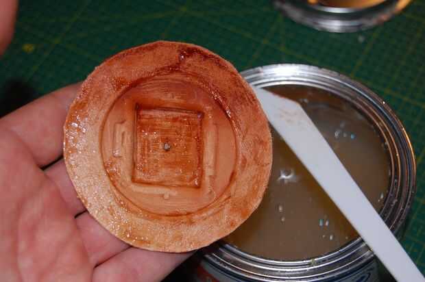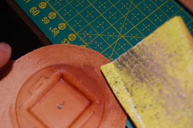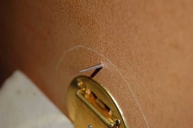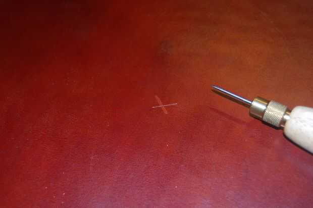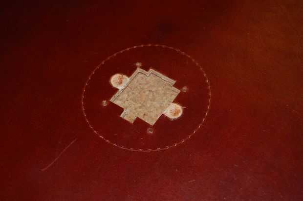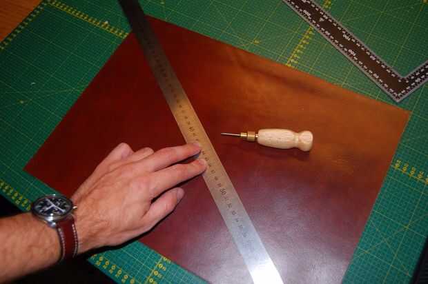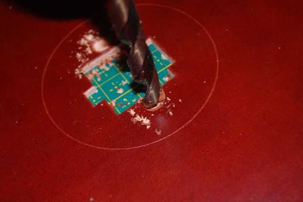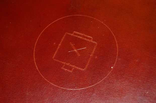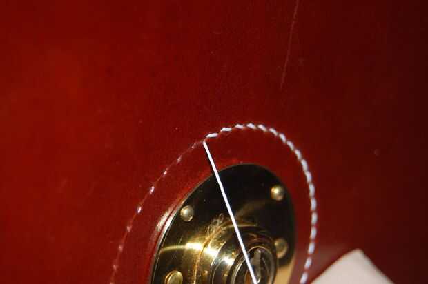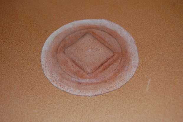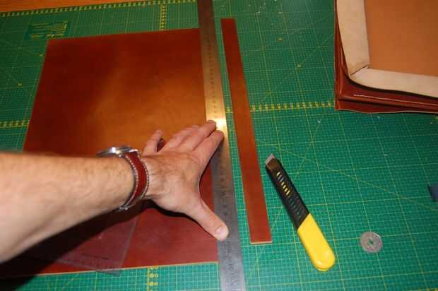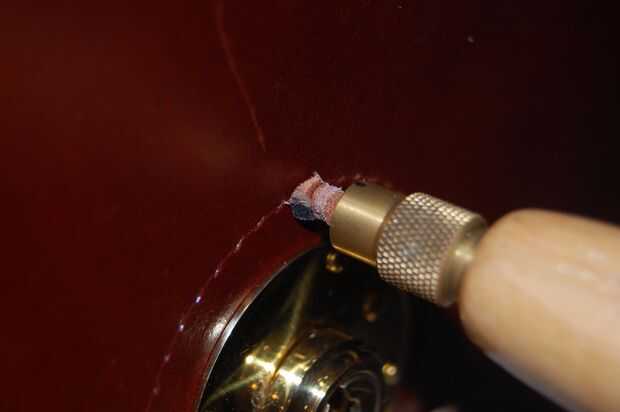 Para cubrir la parte posterior de la cerradura forma un pedazo de cuero (la misma utilizada para la escuadra) mojando el cuero y presionando contra la cerradura. La corte fuera en un círculo con un diámetro de 8,5 cm y skive los bordes antes de cortar a la forma final de (7,5 cm de diámetro).