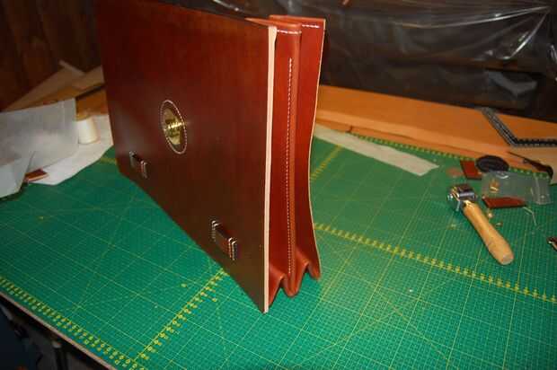 Antes de empezar la costura necesita pegar la pieza frontal y la escuadra Junta. Para poder es preciso poner el frente pieza sobre la mesa y cubrir con papel de cera. Esta forma puede poner el fuelle en la parte superior sin tener que preocuparse por el pegamento de Unión en lugares que no quieres. Comience en la parte superior de la escuadra forma de trabajo hacia abajo a la vuelta de la esquina. Luego comenzar con el otro lado de la escuadra y hacer lo mismo. Cuidar que los bordes alinean. De esta forma que no tienes que lijar mucho para obtener un borde liso.