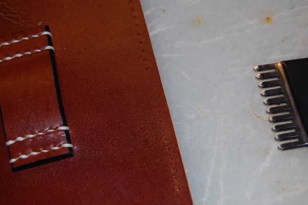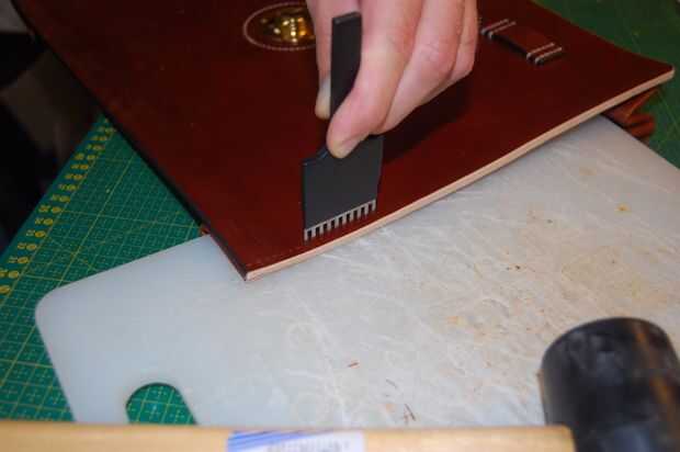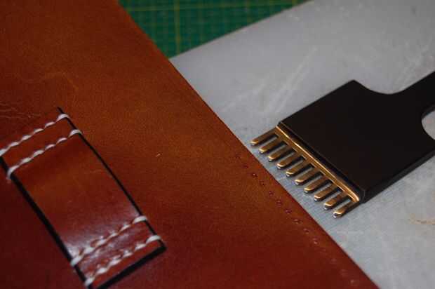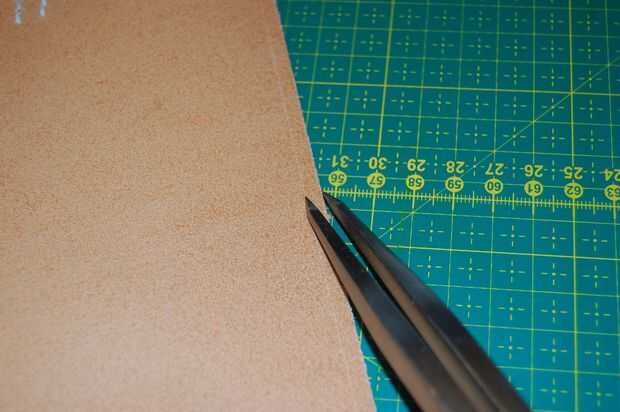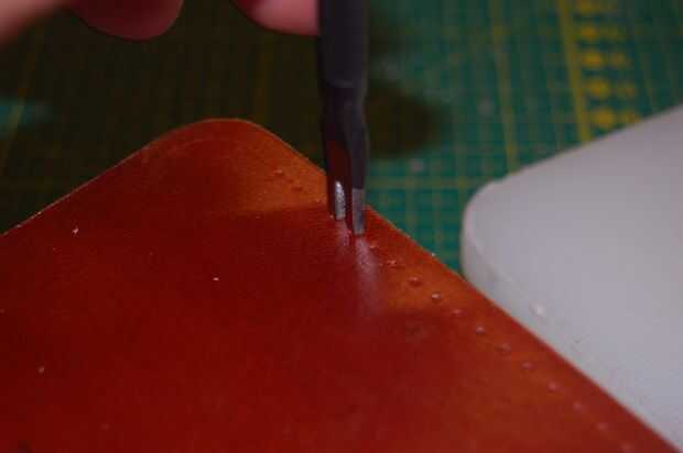 Cuando el cemento haya secado arena los bordes, escriba una línea de costura alrededor de 5 mm del borde y marque los orificios con el hierro punzante.