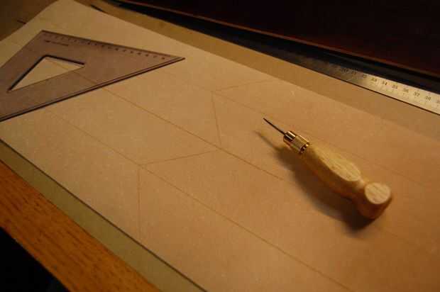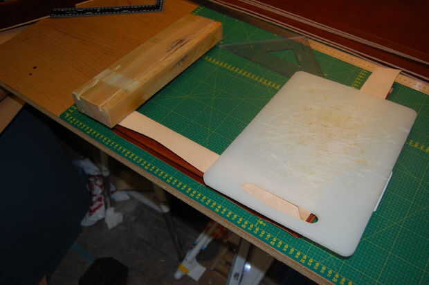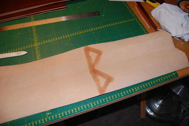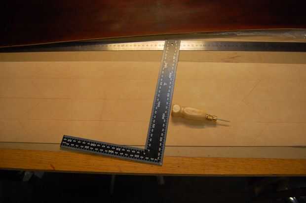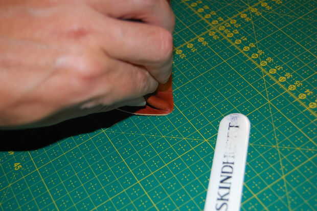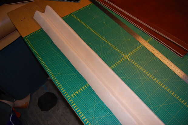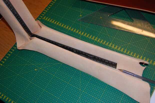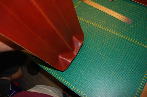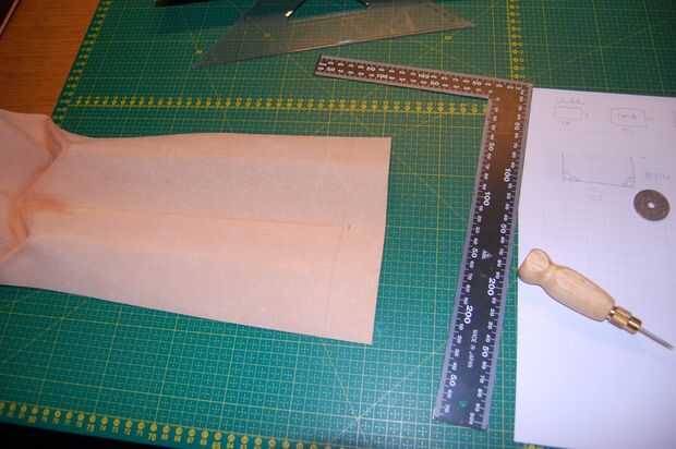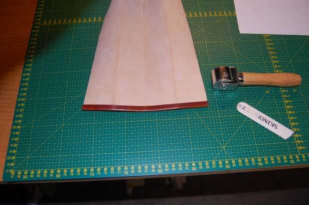 Última vez que hice un escudete usé un ranurador en v para ayudar a la escuadra de la curva en forma. Esta vez yo simplemente marca las líneas de plegado y no use la Ranuradora a rodillos. La piel es tan delgada que esta no debería ser un problema.