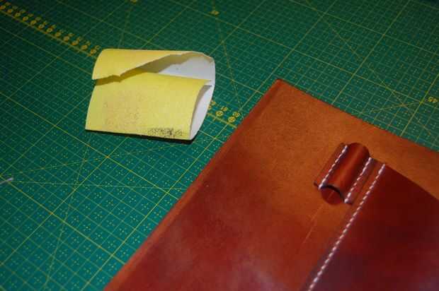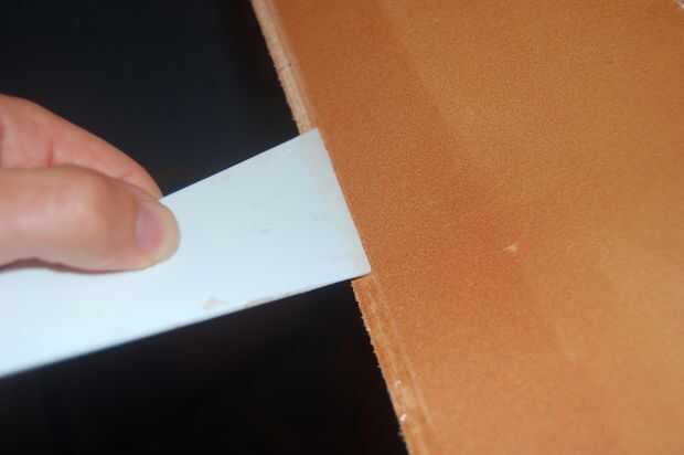 Después de retirar las abrazaderas de papel en un lado sacar el papel encerado encima de unos cm y presione y pellizcar el escudete por el tablero de la partición. Asegúrese de que el tablero de la partición va todo el camino a la escuadra.