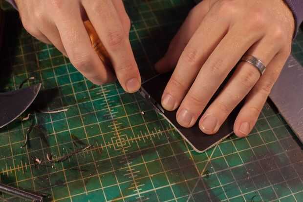 Por suerte, es bastante fácil biselado. Sujete al beveler en 45 grados a la superficie de la piel y correr por el borde. Entonces voltee el monedero para biselar el otro lado.