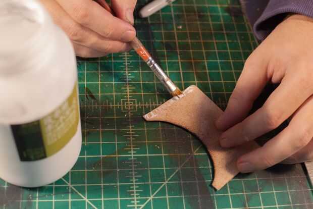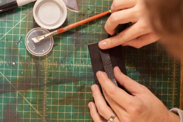 Con un pincel, aplique una capa delgada de pegamento en el borde del cuero. Hacer todo lo posible para pegar sólo el espacio entre el borde y la línea de costura.