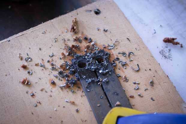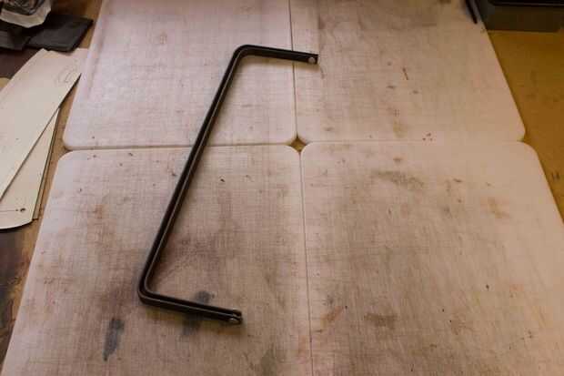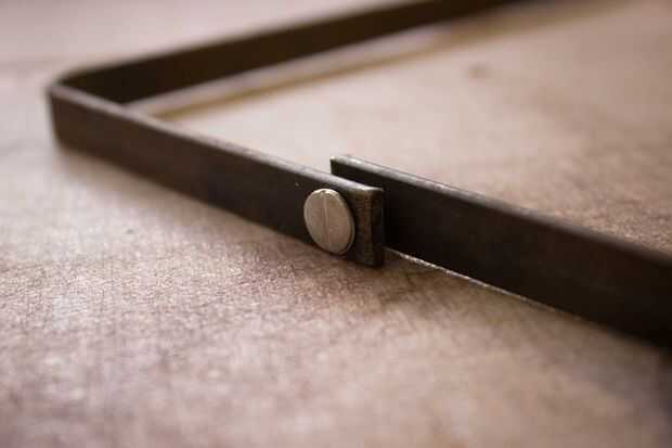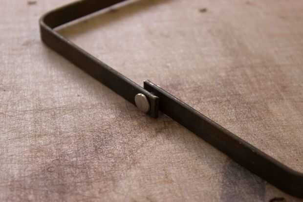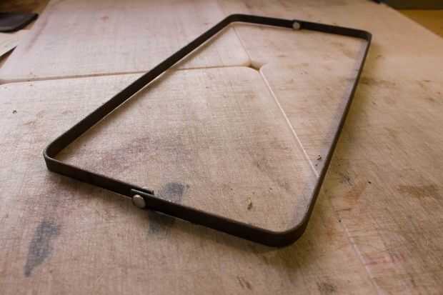 Hice un marco para la boca de la bolsa de 1/8 "x 1/2" acero de la construcción. Dibuje hacia fuera en un pedazo de papel y tome sus medidas de fuera de él. Las dimensiones finales son aproximadamente 15 1/2" de 7 1/2" cuando está abierto. Dar el espacio suficiente para ser envuelto en el cuero de 4-5 onzas y no frotar demasiado. Taladre los agujeros para la bisagra de las mismas dimensiones que sus tornillos Chicago aproximadamente 1/2" del extremo. Prueba hacia fuera.