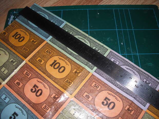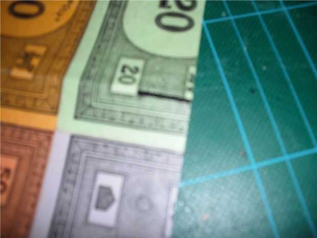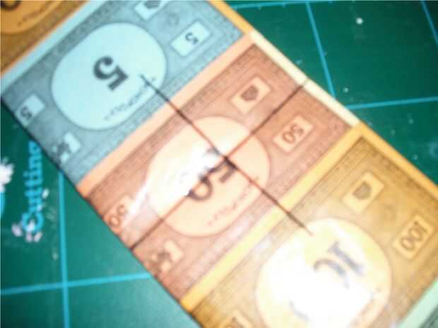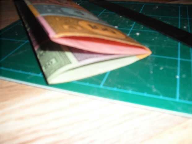 Ahora tienes que recortar los lados. Mida el ancho deseado del doblez de centro en ambos lados (el mío es 9,5 cm) y añadir 1,5 cm (se trata de las aletas que se traben la cartera). Marque esta distancia desde el centro de al menos dos puntos. Corte ahora a lo largo de la línea de estos puntos.