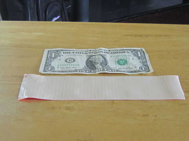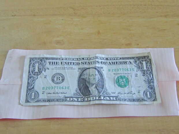 Cortar un pedazo de cinta alrededor de una pulgada más larga que el billete de un dólar. Pone ese pedazo de lado pegajoso hacia arriba. Luego, agregue otra pieza que tiene la misma longitud y se pone uno el otro trozo de cinta por lo que parece la imagen dos.