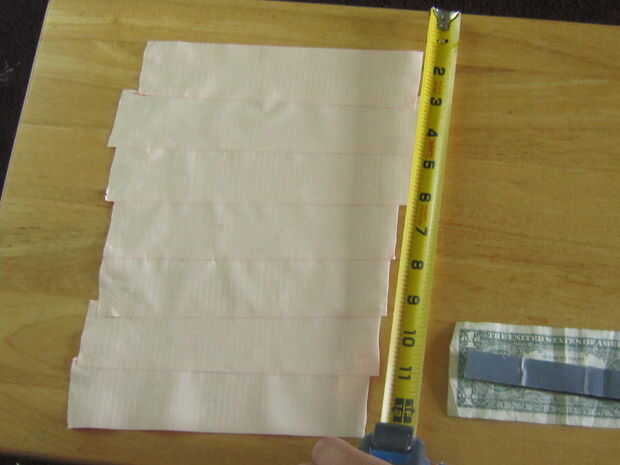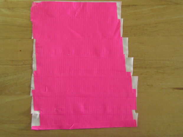 Pone 5 piezas más de la cinta, aún lado pegajoso hacia arriba, una parte superior de uno con el otro. Cuando haya terminado debe ser sobre un pie de largo. Después de eso, poner más cinta, lado pegajoso hacia abajo, encima de la hoja que tienes. Debe terminar buscando algo como la imagen dos.
