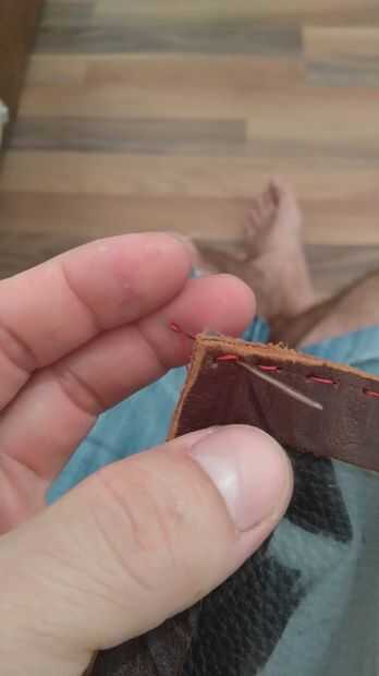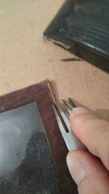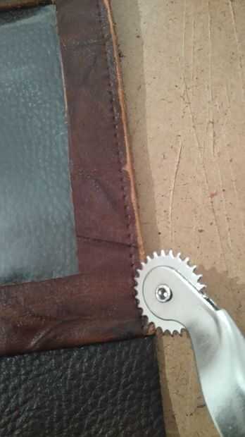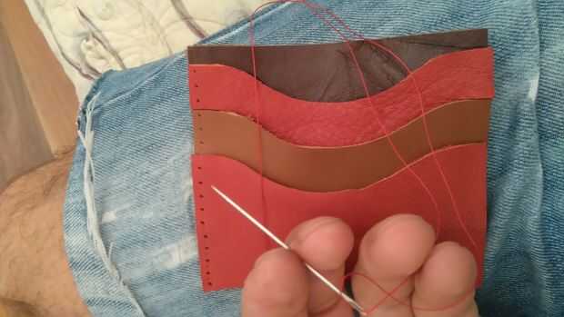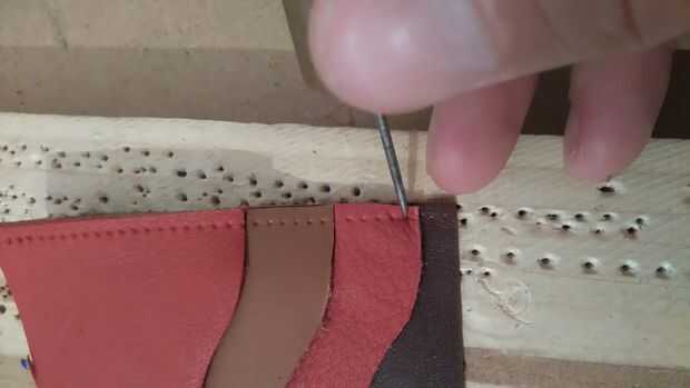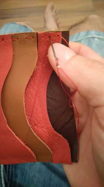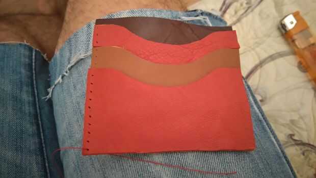 Primero se debe coser solamente un lado de la pieza de ranuras de tarjeta, uno interior. Hacer lo mismo con la parte superior de la ventana de la tarjeta de identificación. He utilizado hilo de cuero de rhin, el mismo tipo usado en chaquetas de cuero, carteras.... Vemos que el tehnique utilizo para coser es la que vino en práctico para mí, siendo similar a dos agujas tehnique pero ligeramente diferentes. Cosa hasta el final de la pieza de atrás cameing para trabar los hilos con un knott y usando un encendedor para sellar y ocultar.