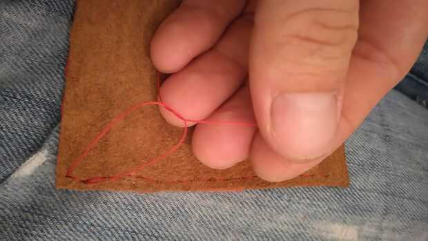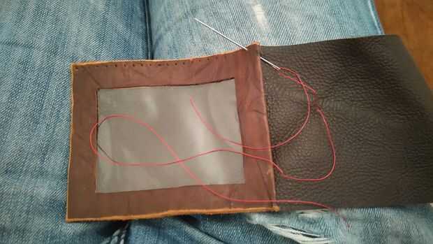A continuación pegué el pedazo con las ranuras de la tarjeta a la cañería adentro, dejando el interior para formes un bolsillo. Ahora cosí la parte superior de esta pieza lo mismo como lo hice a ti la ventana de la tarjeta de identificación.