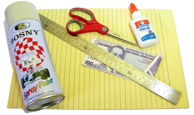-Pintura de Spay de laca clara (para impermeabilizar) -Papel de Pad amarillo (su opción de diseño) -Bill papel (referencia para el tamaño de su billetera) -Multiuso pegamento (pegamento de Elmer) -Par afilado de tijeras -12 pulgadas regla