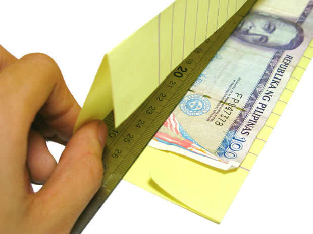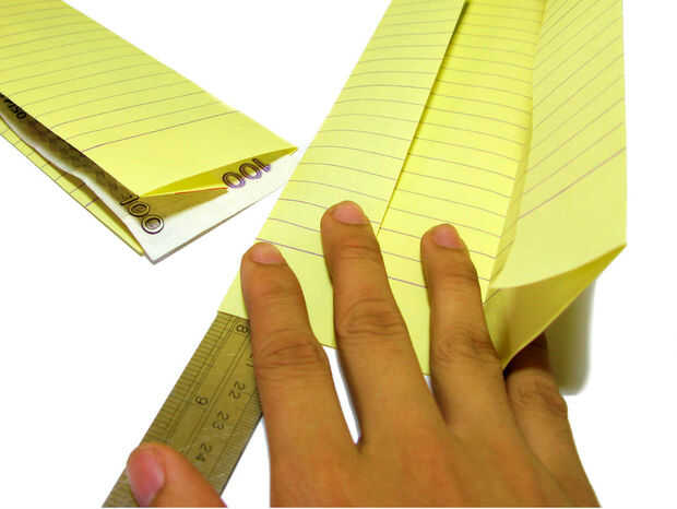 Obtener 2 piezas de papel amarillo de la almohadilla. En primer lugar, doblar en la mitad de veces entonces el hacia el papel sobrante. Se necesitan dos para hacen lo mismo con el otro papel. Uso de que factura como referencia del tamaño de su billetera.