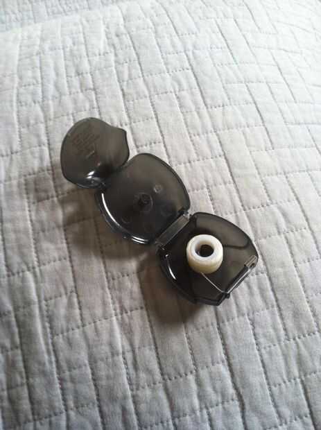 Abra su caja de seda dental y quitar el hilo que está combado hacia arriba dentro de él. Si no tienes ningún hilo allí, está bien. Puede haber un pequeño círculo blanco que envuelve la cadena. Se puede quitar si se desea, y lo mismo va para cualquier etiqueta engomada es en la parte frontal de la seda y el pequeño pedazo de metal en la parte superior. (Es aceptable, si no tienes el mismo modelo que yo).