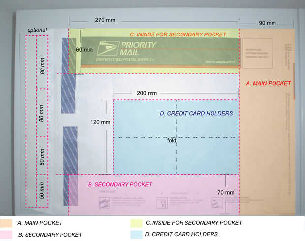 Corte a lo largo de las líneas como se muestra. Terminarás con la parte que es de 90 mm de alto y el bolsillo principal bill. Tenga en cuenta que ya muy bien está sellado en 3 lados para que sus cuentas no se peguen en cualquier cinta. También terminan con parte B que es el bolsillo secundario 70 mm de alto y C la parte interior de la cavidad secundaria 60 mm de alto (B y C son ahora tan sólo un pedazo doblado de tyvek una vez que se cortan aparte de la dotación). Tienes una cantidad de 2 parte D, que son hojas de tyvek 120 x 200 mm. izquierda más será una pequeña cantidad de desecho y la cinta adhesiva.