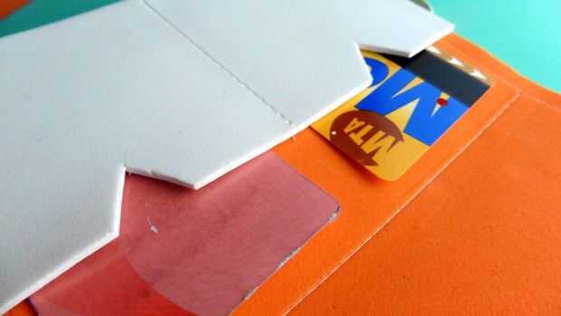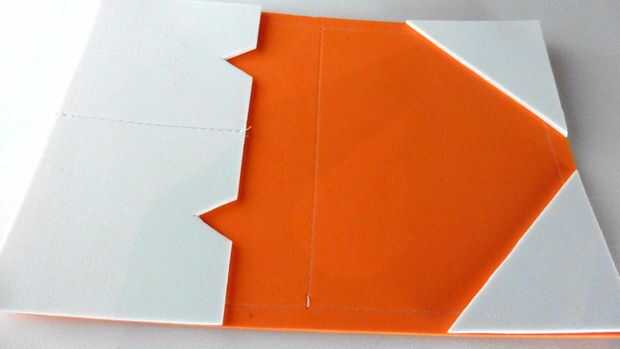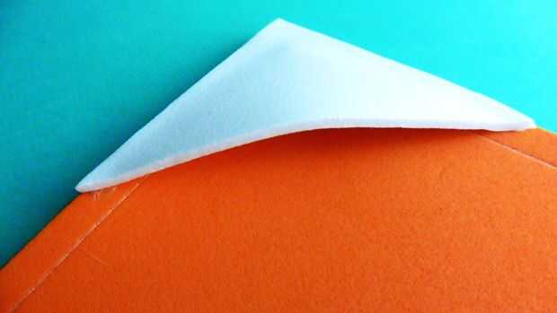 Con pegamento caliente, coloque la pieza de bolsillo a una mitad de la parte interior cubierta y pedazos de la esquina a la otra mitad. El pegamento debe aplicarse a lo largo de la frontera de la cubierta y a lo largo de la costura, si el bolsillo pieza. No pegue los bolsillos o las esquinas cerradas.