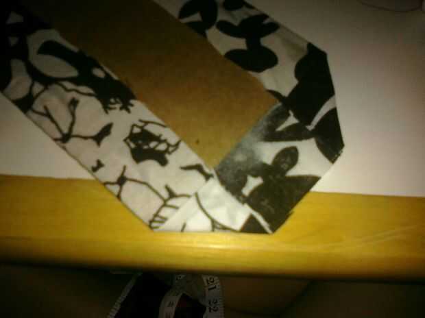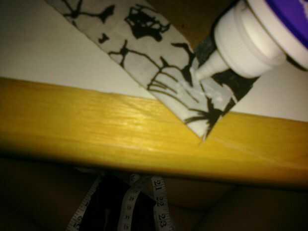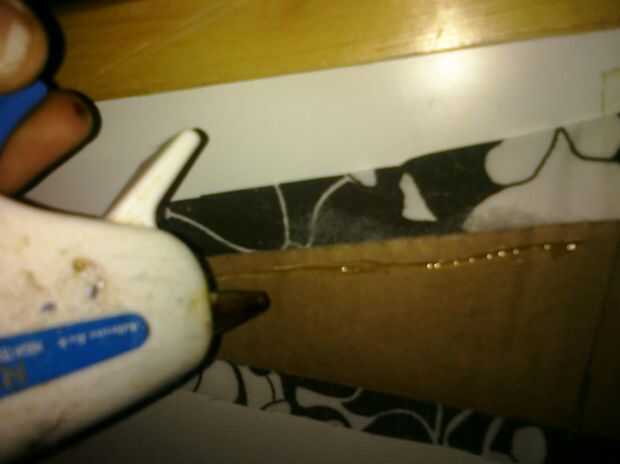 3. las esquinas de la tela sobrante en los bordes pequeñas usando pegamento tack tachuela. Ver la imagen de abajo para un ejemplo. Cuando se haya secado tack, utilice pegamento caliente para doblar para arriba partes pequeñas. Si las esquinas no son tan limpias como gustaría ser, utilice pegamento caliente para meter donde sea necesario. También puede utilizar pegamento caliente para sujetar a tela exceso de veces si es necesario.