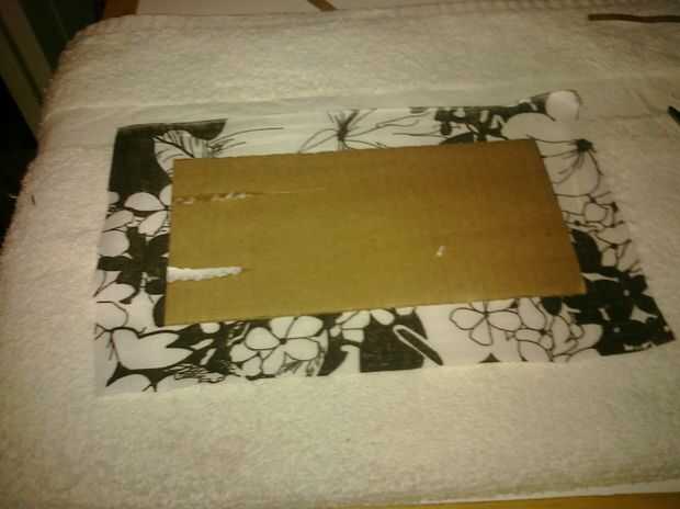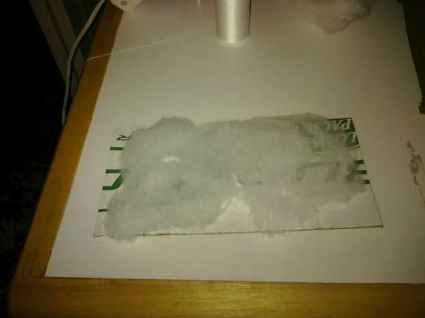 1. difusión hacia fuera de alrededor de 2 bolas de algodón tamaño pedazo de bateo sobre un lado de la cartulina. Luego tapa el cartón entero pieza con bateo sobre que el bateo se reclina contra el lado equivocado de la tela.