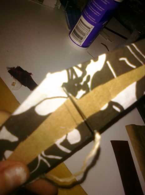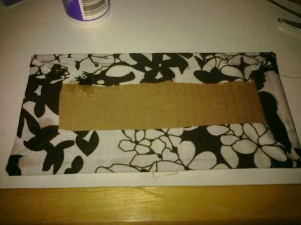 2. Separe una hilera fina de pegamento caliente a través de uno de los bordes laterales de la cartulina. Doblar a la tela sobre el cartón y sujetar en su lugar hasta que se puso rápidamente. Unte pegamento a lo largo de la parte opuesta y tire suavemente la tela antes de plegar en pegamento.