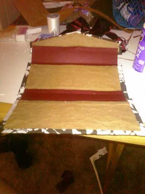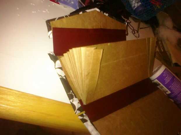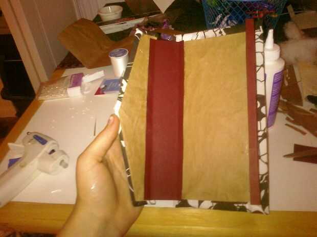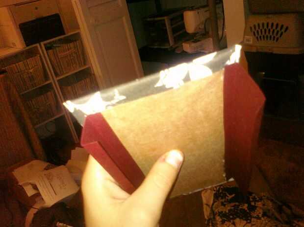 5. Utilice pegamento en la parte superior más pliegues del relleno y fije a la pieza posterior de cartón, asegurando la inserción se centra en la pieza de cartón. También, asegúrese de que la abertura del inserto enfrenta a la pieza triangular. Aplique el pegamento a las otras expuestas W doble aletas y doble la cubierta de libro de cupón sobre el inserto, asegurando al máximo de sus capacidades que la pieza está centrada. Si fueron tontos como yo y no doblar la solapa acción inferior tarjeta en una W, aplique presión con el dedo en un lado y empujar ambas piezas de cartón junto a la fuerza en uno ahora. Dejar la cartera abierta y coloque el peso sobre las piezas rectangulares hasta que se seque.