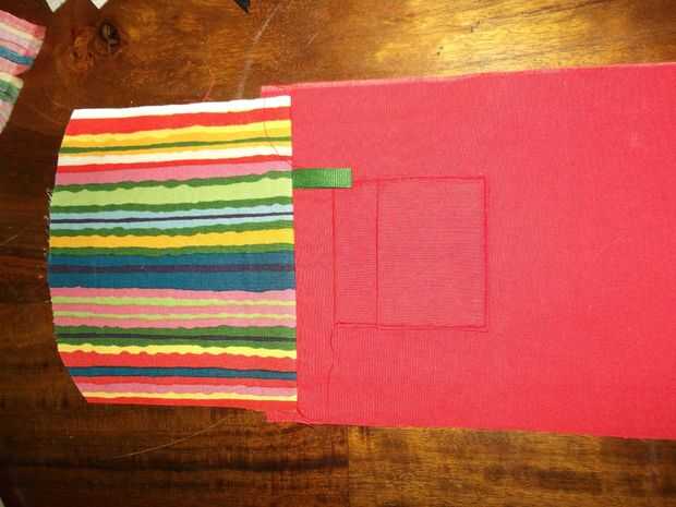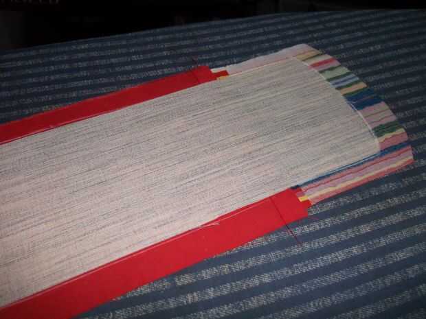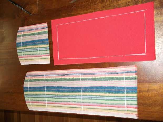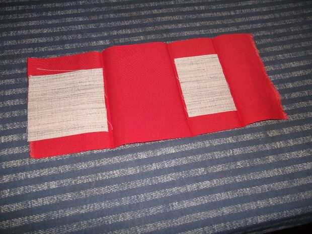 Si quieres poner un doble bolsillo interior, cortar pequeños trozos de entretela (el tamaño de las bolsas que desee) y arreglarlos como mostrado en la foto en un trozo de material de revestimiento. Puede entonces doblar el material sobre ellos y pliegue el dos pocktes juntos para que la interfaz está cubierto por todos lados.
