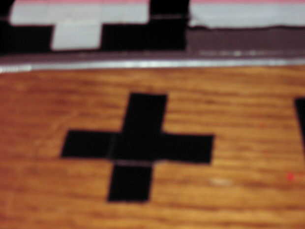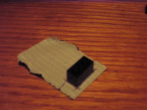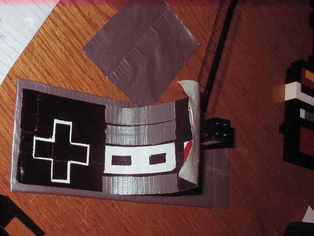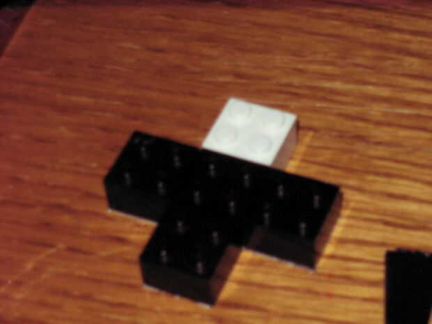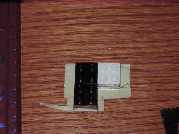 Ahora toma 3 legos cuadrados y situado en el lado pegajoso de una pequeña tira de cinta blanca en forma de ángulo recto. Trace una línea alrededor de los legos con su pluma y con su cuchillo x-acto corta alrededor de los legos y la cáscara apagado la cinta sobrante.