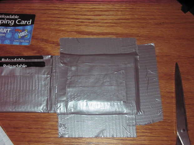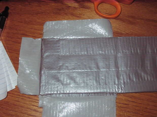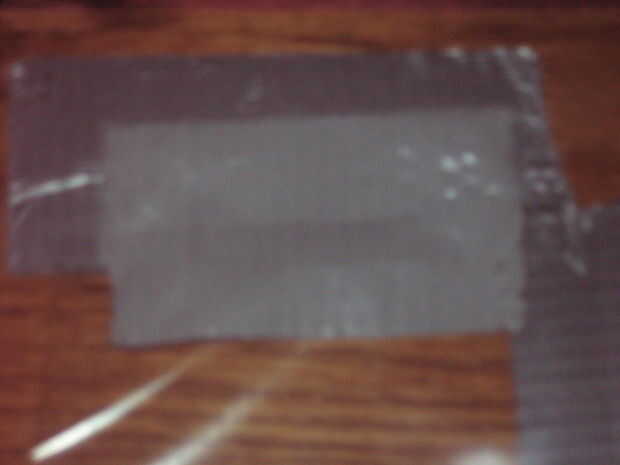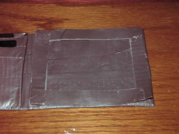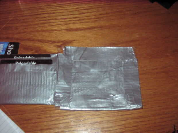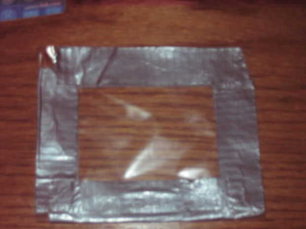 Luego tomar la bolsa zip-lock y con su cuchillo x-acto corta un trozo que es 4 x 5 pulgadas de largo. Ahora una de las más pequeñas tiras de cinta adhesiva, dale la vuelta y coloque el extremo corto de la plástica hasta la mitad sobre la tira de cinta adhesiva y doblar el otro lado de la cinta del conducto sobre el plástico, hacer lo mismo con los cuatro lados restantes. (ver fotos para obtener más instrucciones y ayuda)