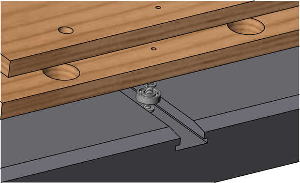 En lugar de montar a caballo por las ranuras de inglete sobre rieles (como hacen la mayoría de trineos) este diseño utiliza rodamientos de bolas que funcionan contra el interior borde de las ranuras de inglete. Instale los cojinetes en la parte inferior de las placas de patín mediante tornillos de alta resistencia con cuellos que encajan perfectamente el diámetro interno de los rodamientos. Los cojinetes deben girar libremente de la parte inferior de las placas de patín, así que puse un par de arandelas estrechas entre cada rodamiento y la parte inferior del trineo. Si tus ranuras de inglete son especialmente profundas, puede que necesite avellane cada conjunto de cojinetes en la parte inferior del trineo, o alternativamente la rutina un poco hacia abajo la cabeza del tornillo.