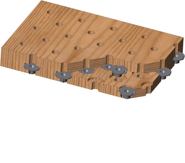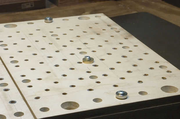 Cada placa del patín (derecho e izquierdo) se compone de dos capas de madera contrachapada. Cada capa recibe muchos agujeros perforados a través de él antes del montaje.