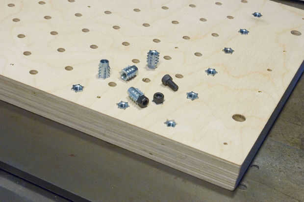 Usando estos insertos roscados era conveniente, pero son caros y difíciles de encontrar. En la retrospección deseo que yo había utilizado tuercas tee avellanadas entre las capas de las placas de patín. Hubiera sido mucho más trabajo para perforar los Avellanadores, pero creo que hubiera sido la pena al final.