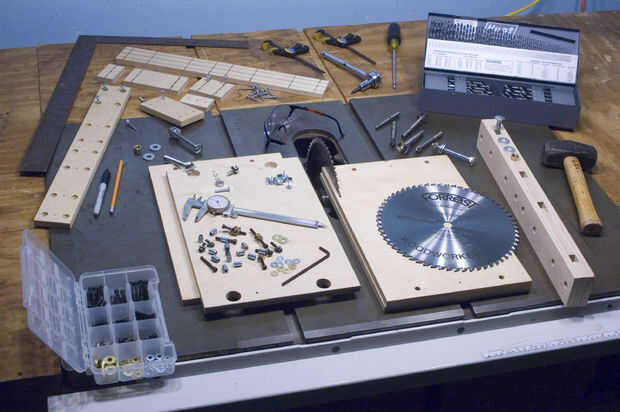 Asegúrese de que alinear las monturas de soporte transversal recto y liso cuando les atornille. Apriete todos los tornillos y luego volver ellos apagado un par de vueltas para asegurarse que todos los siete bloques de madera son libres de ruido alrededor. Si este no es el caso, puede que necesite volver y ampliar algunos de los agujeros de tornillo de gran tamaño. Alinee el montaje suelto utilizando la superficie de la sierra como plano guía. Al hacer el ajuste final de los tornillos, ir sobre ella de una manera gradual y (suavemente) con un martillo a lo largo de la manera de empujar todo al ras.