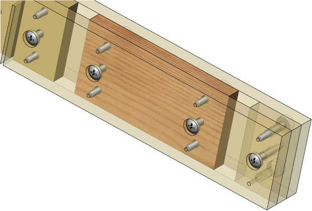 Las tres capas de soportes transversales se mantienen Unidos mediante tornillos que vienen en ambos lados. Utilizar un montón de tornillos - realmente quieres las monturas de soporte transversal para ser robustos. Cada tornillo debe caer libremente a través de agujeros de gran tamaño en las primeras y segunda capas de la madera, sólo muerde en la tercera capa profunda.